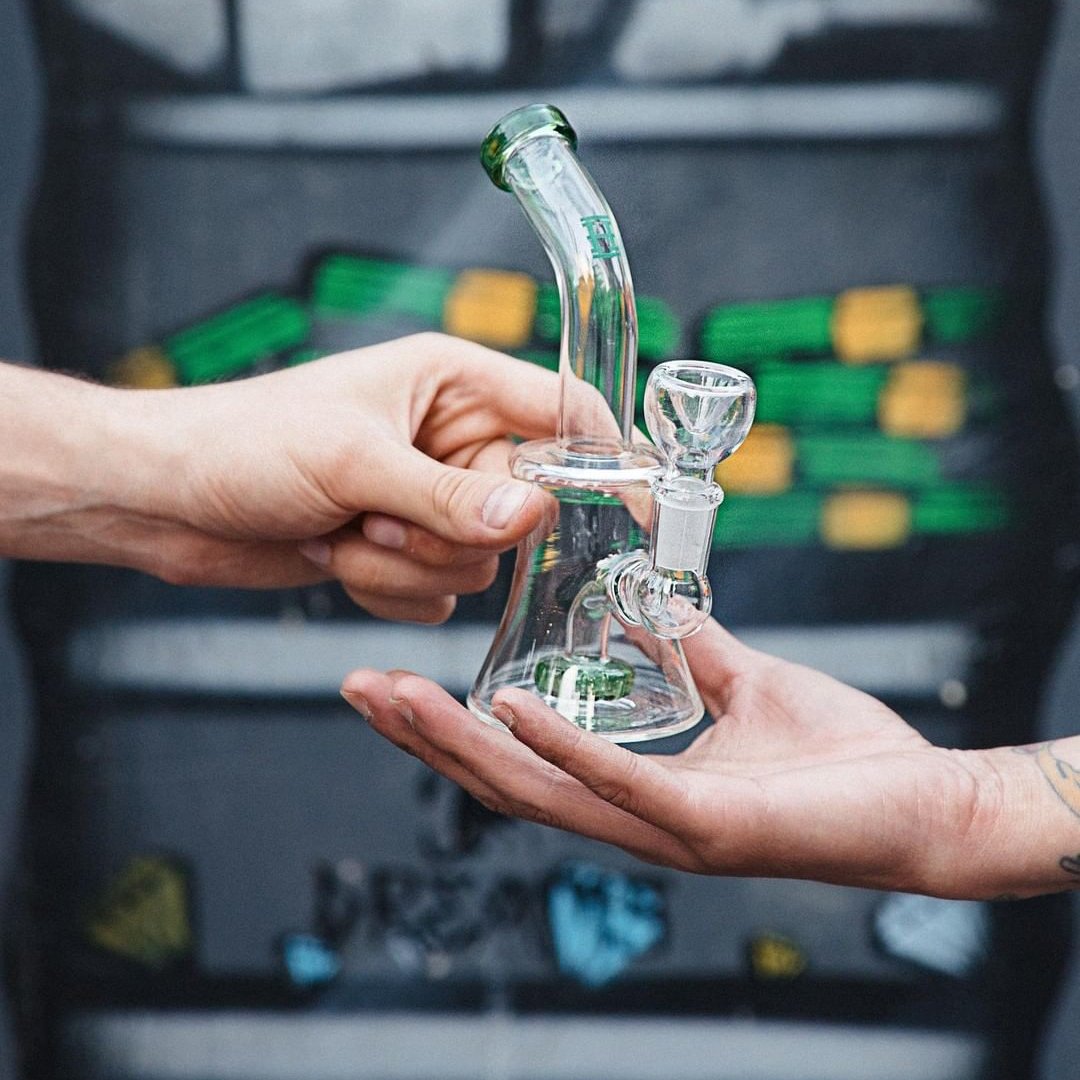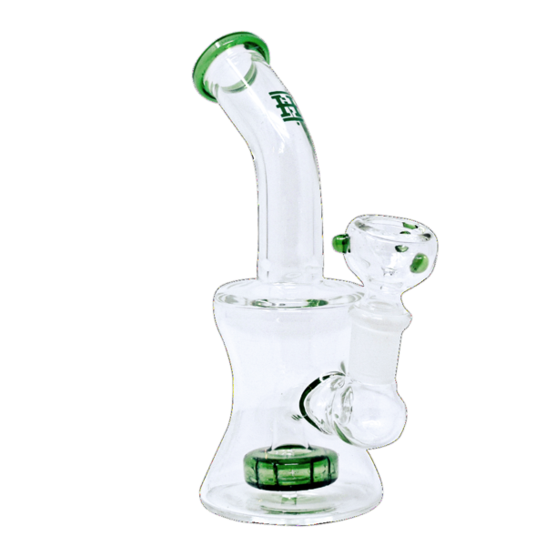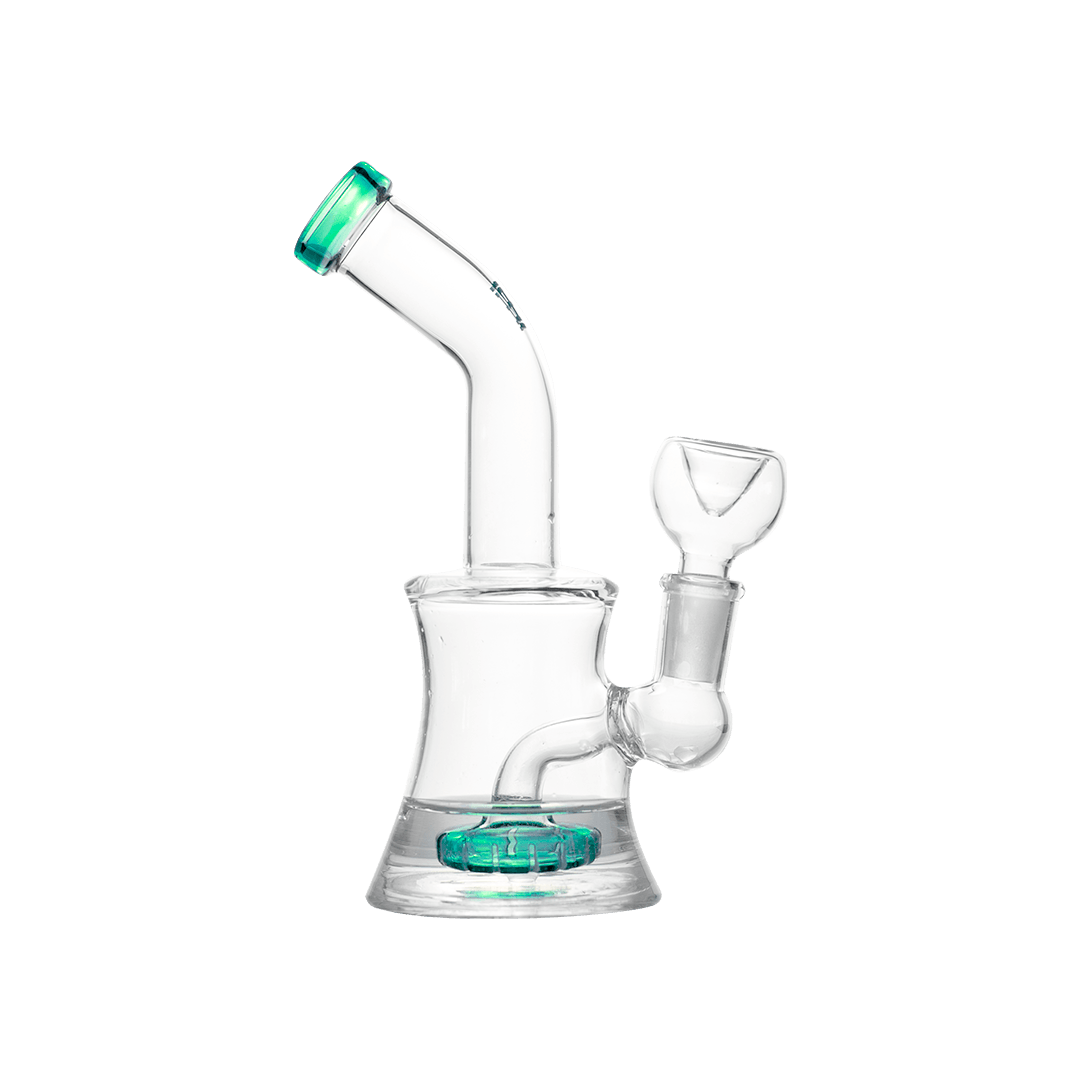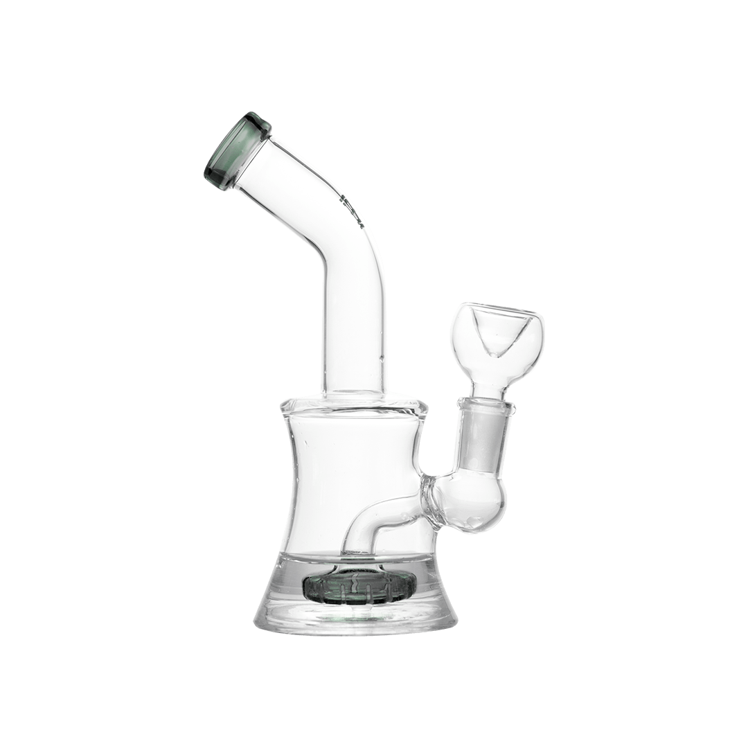 First featured in the Kimmy Tan collaboration box, the HEMPER Hourglass rig features a dropped showerhead percolator. The unique shape of the hourglass compliments water percolation perfectly. Due to its concaved sides, water that is splashed up is deflected back down to continue to mix with hot smoke. It also acts to prevent any unwanted splashback into your mouth, even as such a compact and flavorful rig!